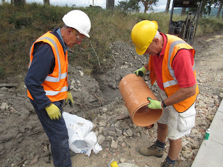 Here the first length is in, and is already being back filled again. JC is carefully checking the height of the junction box, as it has to be right for when the tarmac goes in, and at a level slightly below the copers. That pipe going over was a surprise find - luckily we didn't damage it, and managed to put it back together again. It's a new water supply pipe for the platform 2 building, whichever form it may take. Although there is currently no funding for anything, the CAG were careful to give it a supply of water and electricity, for later.